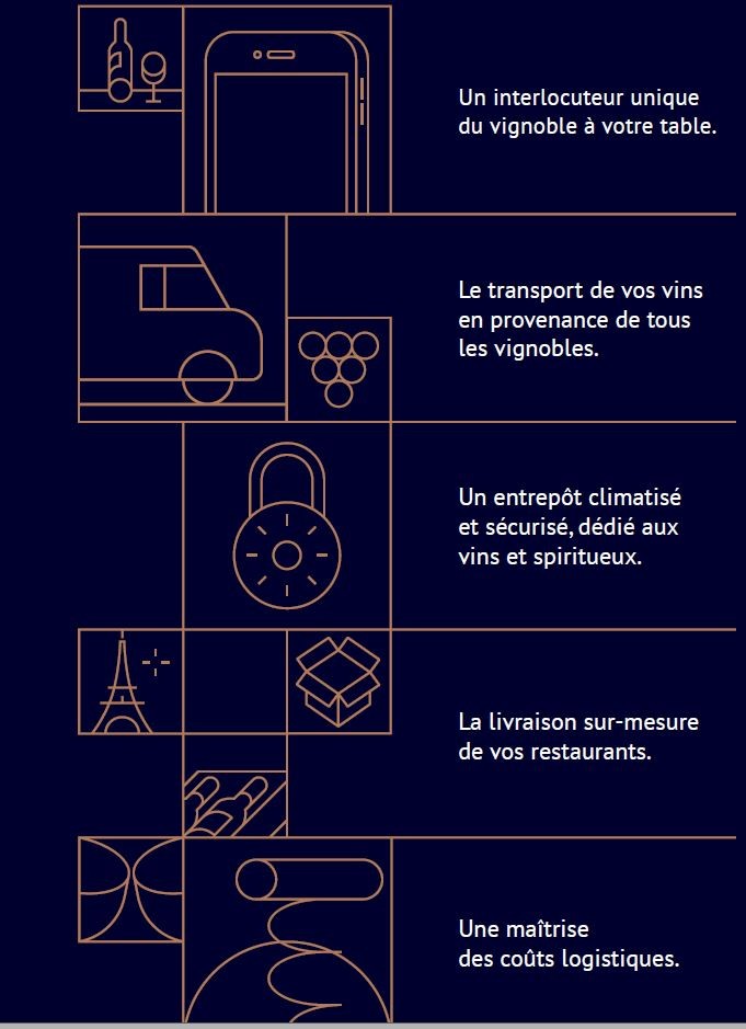 Solution flexible et adaptable, le « Cellier du Sommelier » est un service personnalisé de la vigne au verre. Il orchestre le retrait des vins dans les domaines viticoles, leur transport et leur stockage en toute sécurité dans les meilleures conditions puis leur re-livraison sur-mesure aux horaires et coûts prévus pour une logistique maitrisée de l’amont à l’aval. Sa force : un interlocuteur unique, de la vigne au verre.